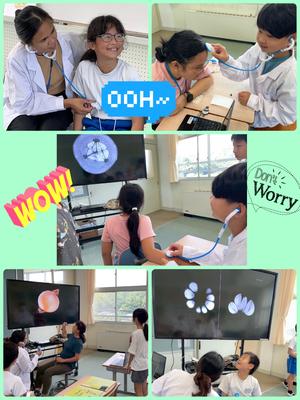 今月の休み時間の英語活動、Kザニアのテーマは、「病院」です!おもしろいMRI検査をして、病院で使う英語表現を学びました!