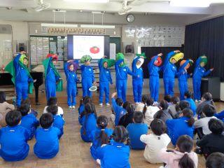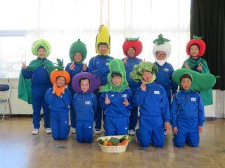 10月に後期保健体育委員会が発足してから、この日のために、テーマを考えたり、免疫力やビタミンACEについて調べたりしました。当日は、担当した野菜について調べたことを、保健福祉事務所からお借りした「野菜のかぶりもの」を身に付けて発表しました。