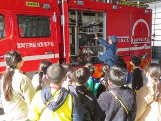 社会科の学習で、消防署の見学に行ってきました。普段は見られない建物の中を見学したり、消防車や救急車を間近でみたり、みんな興味津々でした。町の暮らし守る消防署の人たちの工夫や努力を学びました。