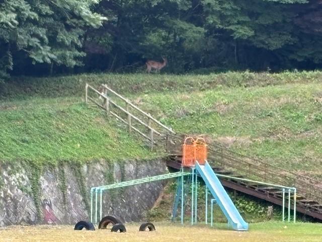 本校では、幸い熊の出没情報はありませんでしたが、イノシシやシカ、アナグマなどの動物の足跡が朝の校庭に残されています。今年はいつにも増してイノシシが校庭を深く掘り起こしミミズを食べに訪れていました。夏休みには、下の写真にもあるように、若いシカが校庭と山里のちょうど境目に慌てる様子もなくしばらくの間のんびりとこちらをながめている様子が見られました。山里の下草の手入れの難しさ、気候を含めた環境の変化など、様々な要因で動物と人間との緩衝地帯が狭まり、明らかに双方の距離が近くなっています。かわいいシカの姿に思わずシャッターをきるのと同時に、人と動物との見えない境界線を目の当たりにしたような気がしました。