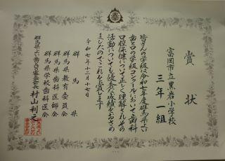 11月17日に群馬会館で行われた「群馬歯科保健大会」で、よい歯と口の学校と学級の表彰式があり、3年1組が受賞しました。